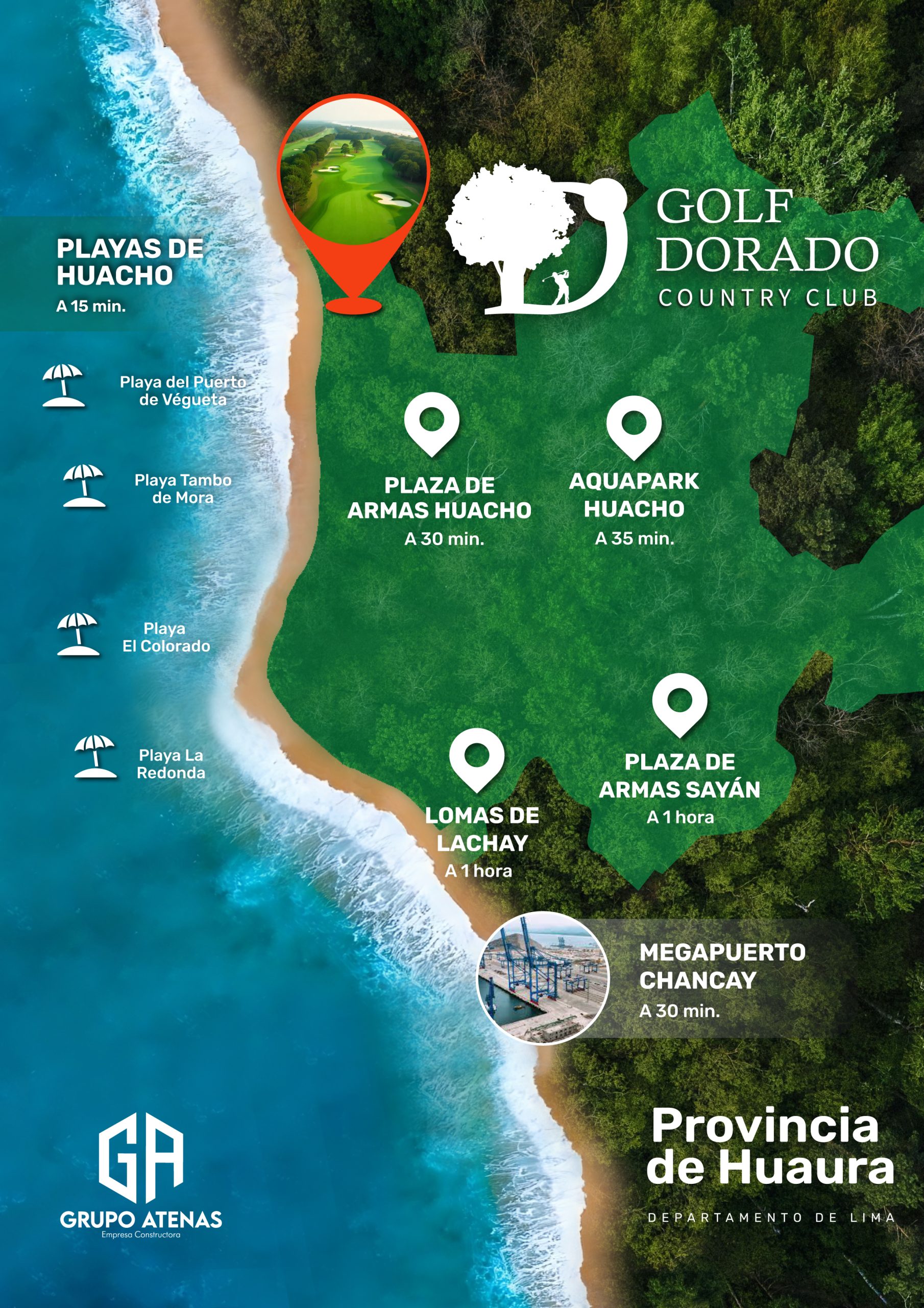 Golf Dorado se encuentra a 10 minutos de la carretera Panamericana Norte KM 164, a 30 minutos de la Plaza de Armas de Huacho, a 35 minutos del Aquapark Huacho, a 1 hora de la Plaza de Armas del distrito de Sayán y a 1 hora de las Lomas de Lachay.